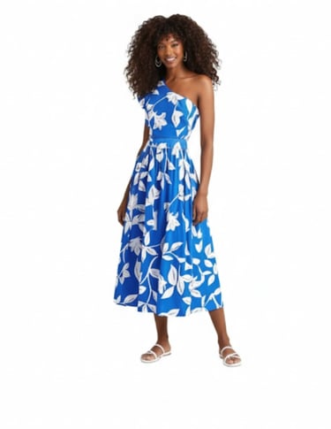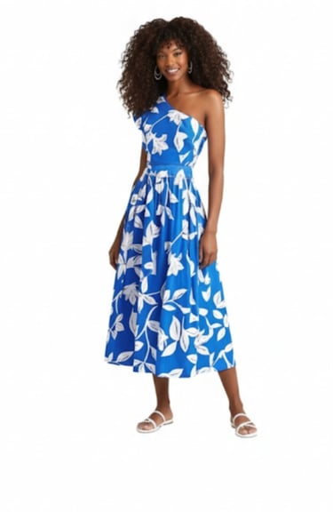 If you’re looking to capture that "Mediterranean summer" aesthetic without leaving your zip code, this blue and white floral J. Crew midi dress is your new best friend. The one-shoulder neckline and ruffled detailing offer a sophisticated architectural edge, while the crisp botanical print feels timeless and incredibly refreshing. With its cinched waist and breezy A-line skirt, it strikes the perfect balance between polished and playful. It’s the kind of piece that makes a statement without trying too hard. Just add a pair of espadrilles and some oversized gold hoops to complete the look.